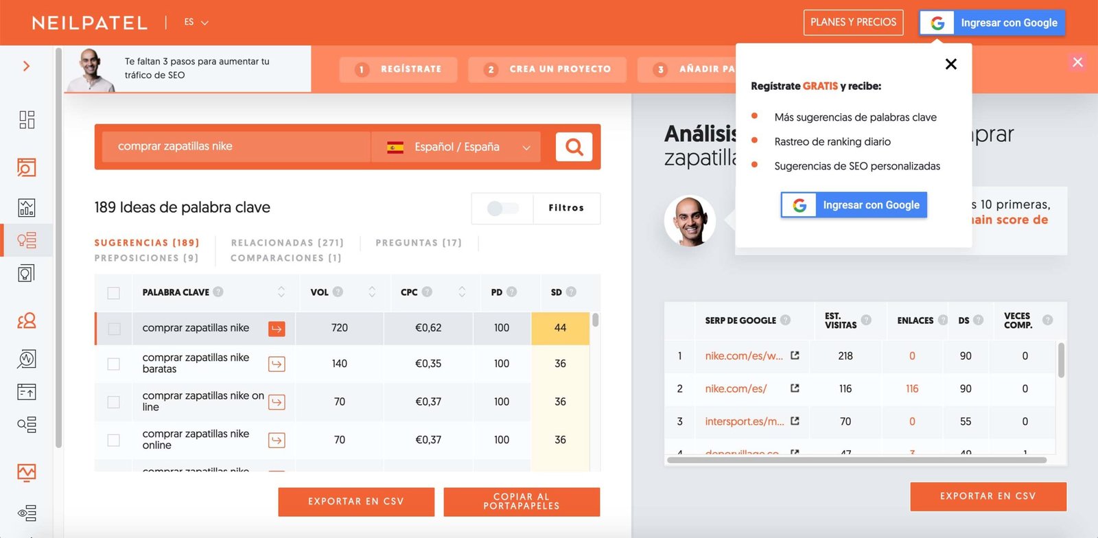En nuestro ejemplo solo hay una debido a la limitación de la herramienta gratuita y sería “comprar zapatillas nike baratas”, ya que tiene unas búsquedas considerables y no tanta competencia (aunque siendo objetivos, nuestro estudio buscaría más pues las hay mejores y esta sigue contando con una competencia descomunal).